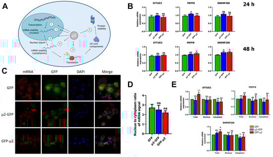 2.1. The μ2 Protein Does Not Impact EFTUD2, PRPF8, and SNRNP200 mRNA Levels or Nuclear Export