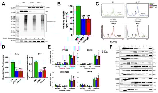 The μ2 protein impairs translation: (A) WB of newly synthesized proteins in HEK 293T cells expressing GFP, μ2-GFP, or GFP- μ2. Cells were transfected for 48 h, newly synthesized proteins were metabolically labeled with AHA for 4 h (or DMSO for control), a biotin moiety was added using CLICK chemistry and revealed using streptavidin-HRP. A loading control (actin) was loaded and a WB against GFP was realized to validate the expression of GFP and fusion protein between GFP and μ2; (B) quantification of three independent experiments. Biological replicates, n = 3, one-way ANOVA with Dunnett’s multiple comparisons test against the GFP alone condition (***, p ≤ 0.001); (C) polysome profiles for control GFP or μ2-expressing cells. Polysome to monosome ratio (P/M) and heavy to light ratio (H/L) were calculated as described in the material and methods section. Respective profiles were overlapped by aligning the 40S to the same height; (D) polysome to monosome ratio (P/M) and heavy to light ratio (H/L) from three independent experiments for control GFP or μ2-expressing cells. Biological replicates, n = 3, one-way ANOVA with Dunnett’s multiple comparisons test against the GFP alone condition (***, p ≤ 0.001); (E) relative mRNA level determined by qPCR for EFTUD2, PRPF8, SNRNP200, and GAPDH in 40S + 60S, 80S, and polysomal (P1 + P2 + P3) fractions from GFP or μ2-GFP expressing cells at 48 h post-transfection. Lysates were prepared, separated on a 5–50% sucrose gradient, and 30% of each fraction was subjected to RNA extraction using Qiazol. RNA was reverse transcribed using a fixed volume for each sample and subjected to qPCR with U6 snRNA as the housekeeping gene, as it was stable between all fractions. The relative expression is calculated against the first sample in the GFP condition for the 40S + 60S fraction. n = 3, biological replicates, two-way ANOVA with Dunnett’s multiple comparisons test against the GFP control for each fraction (ns, p > 0.05); and (F) WB against GFP, RPL19 (large subunit), RPS2 (small subunit), and actin in polysomal fractions from control GFP or μ2-expressing cells at 48 h post-transfection in HEK 293T cells. Results presented are mean ± standard deviation.