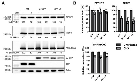 The μ2 protein does not impact EFTUD2, PRPF8, and SNRNP200 protein degradation: (A) WB of EFTUD2, PRPF8, and SNRNP200 in HEK 293T cells transfected for 24 h with GFP, μ2-GFP, and GFP-μ2, and then treated with 100 μg/mL CHX or DMSO for an additional 24 h. Relative quantification is shown and normalized for 100% in the same construction for the control condition; and (B) quantification of three independent experiments. n = 3, biological replicates, two-way ANOVA with Dunnett’s multiple comparisons test against the GFP alone condition; only the result of the comparison in the CHX condition is presented (ns, p > 0.05). Results presented are mean ± standard deviation.