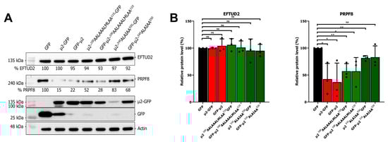 The μ2 protein is localized in both the nucleus and the cytoplasm in transient transfection; however, during infection, it was never observed in the nucleus of infected cells [16,33,34]. Notably, U5 snRNP proteins are mainly nuclear, which suggests that μ2 could interact with these proteins in the nucleus. To assess the necessity of μ2′s presence in the nucleus to reduce U5 snRNP protein levels, we used recently described mutants of μ2 unable to enter the nucleus [16]. Briefly, basic residues in two possible NLS (100RRLRKRLMLKK110 and 545RLKIPY550) were mutated to alanine, and these mutations were shown to be sufficient to prevent the nuclear accumulation of μ2 [16]. We monitored the levels of PRPF8, known to be sensitive to μ2’s presence, and EFTUD2, known to be insensitive to the presence of μ2, in cells expressing these mutants tagged with GFP in either N-terminal or C-terminal as well as GFP, μ2-GFP, and GFP-μ2 as described before. The inability of the mutants to enter the nucleus did not drastically impair their ability to decrease the levels of PRPF8 (Figure 4A). This was observed despite the fact that these mutant μ2 proteins are expressed at the same, or slightly decreased level as the wild-type protein. Quantification of three independent experiments revealed that these mutants retain the ability to reduce PRPF8 protein in a similar fashion than the wild-type μ2 (Figure 4B). As previously described, EFTUD2 levels were not changed by the ectopic expression of μ2 [16]. Altogether, these results further suggest that μ2 exert its effect on U5 snRNP proteins in the cytoplasm by blocking mRNA translation, and that the nuclear localization is mainly dispensable for most of this effect.