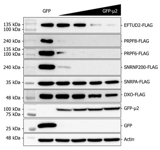 Since U5 snRNP core components are translated in the cytoplasm, but the assembled mature U5 snRNP is nuclear, experiments analyzing the impact of μ2 always monitored EFTUD2, PRPF8, and SNRNP200 without discriminating between the cytoplasmic and the nuclear pools. The fact that μ2 impairs translation in the cytoplasm suggests that the nuclear pools of these proteins are not affected by μ2, and that focusing on the cytoplasmic pool might be more relevant. Moreover, the bulk of these proteins is thought to be localized in the nucleus; this suggests that the effect we observed might be more important and clearer if experiments could be realized in the absence of a pre-existing level of these proteins. To allow the monitoring of the impact of μ2 in the absence of a pre-existing level of these proteins, we tested if the presence of μ2 could suppress the ectopic expression of these U5 snRNP proteins. Moreover, this system also allowed us to investigate if the effect of μ2 on the U5 snRNP proteins is dose-dependent, by progressively increasing the levels of μ2. We therefore co-transfected constant amounts of plasmids encoding EFTUD2-FLAG, PRPF8-FLAG, and SNRNP200-FLAG, alongside increasing amounts of the plasmid encoding GFP-μ2. Even when the lowest amount of GFP-μ2 is expressed, the expression of both PRPF8-FLAG and SNRNP200-FLAG is nearly completely suppressed compared to the GFP control (Figure 5). EFTUD2-FLAG expression is more tolerant to μ2 presence but is also drastically suppressed at higher μ2 concentrations. Moreover, we also tested a PRPF6-FLAG construct, which expression was suppressed by the presence of μ2 in the same fashion as PRPF8-FLAG and SNRNP200-FLAG. As controls, we also monitored another protein of the spliceosome, the U1 snRNP protein SNRPA, which showed a very limited impact of μ2 on SNRPA-FLAG expression. DXO, a decapping enzyme and exonuclease involved in RNA metabolism, was also tested as an additional control, and showed to be much less sensitive to μ2 expression than U5 snRNP proteins. Therefore, we can conclude that U5 proteins expression is highly sensitive by the presence of μ2 in a dose-dependent manner.