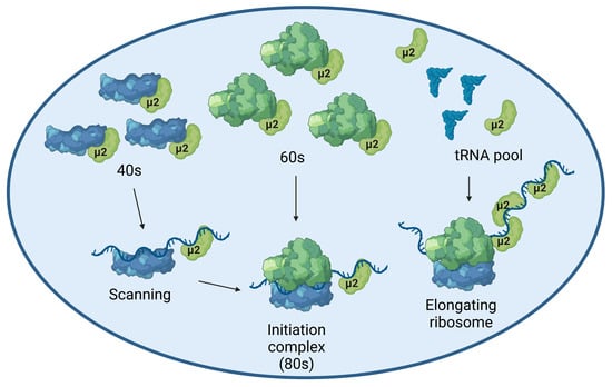 Model depicting how μ2 might exert its effect on translation. μ2 might interact directly with the small subunit of the ribosome, or the large subunit, as recently suggested by IP-MS data of the interactome of μ2 [16]. Moreover, μ2 is bound to cellular mRNA, which might affect the initiation steps of translation. Since μ2 elutes with all the light polysomal fractions (40S, 60S and 80S), all these possibilities are supported by our experimental data. Furthermore, the elongating ribosome is bound to encounter μ2 attached to the mRNA, which might alter the stability of the elongating ribosome. Finally, μ2 might interact with numerous tRNA synthetase, which could affect the pool of loaded tRNA available for the elongating ribosome. Created with Biorender.com.