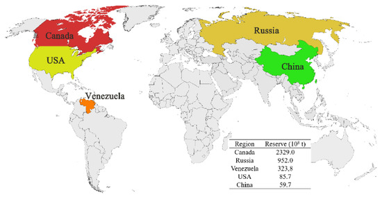 Energy and environmental issues have been paid constant attention. As one of the three major fossil energy sources and important chemical raw materials, petroleum resources play a major role in the development of human society and the economy [1]. However, with the large-scale exploitation and consumption of crude oil, the output of conventional oil resources is gradually decreasing [2]. This has become an important factor affecting the stable development of the world economy and society. With the decrease of conventional petroleum resources and the rise of production costs, the development and utilization of unconventional petroleum resources has attracted extensive attention [3]. Among these, the exploitation and utilization of unconventional heavy oil ores have also attracted the widespread concern of scientific researchers [4,5]. The distribution and reserves of unconventional heavy oil ores (UHO) are shown in Figure 1 [6]. Unconventional oil deposits, mostly located in North America, Eastern Europe and Latin America, are enormous with proven reserves of more than six trillion barrels of recoverable oil by current technologies, accounting for about 70% of total world oil reserves [7,8]. In China, unconventional oil reserves are relatively large and are mainly distributed in Inner Mongolia, Xinjiang, Shanxi, Heilongjiang, Liaoning provinces, etc. [9]. The proven reserves of oil shale resources are 311.7 × 108 tons and oil sands reserves are 59.7 × 108 tons [10]. Therefore, as an important part of fossil energy, UHO possesses great mining and utilization value. In addition, the rational development and utilization of UHO is of great significance in promoting the optimization of the global energy structure.