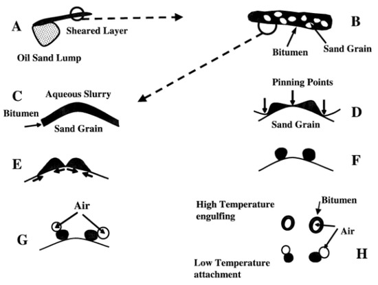 In addition, the composition of heavy oil also directly affects the oil–solid interaction. Kumar et al. [64] found that polar components in heavy oil possess a stronger affinity for solid surfaces, making them more hydrophobic. For example, the asphaltene component in heavy oil—as an important type of interfacial active substance, the interaction between asphaltene and solid has also been widely considered. Abraham et al. [65] found that the repulsion between asphaltene and silica increases with an increase in pH of an aqueous solution, This indicates the presence of pH-dependent ionizable/polarized groups on the asphaltene surface. Compared with hydrocarbon oil components, there is a strong polar interaction between ionizable/polarized groups in asphaltene and silicon hydroxyl groups on the surface of silica [66,67], which enhances the affinity between asphaltene and solid surface. Given the above, we can see that the interaction between heavy oil components and mineral solids plays a key role in the separation system of UHO. Their interaction is directly affected by mineral type, heavy oil composition and water chemistry.