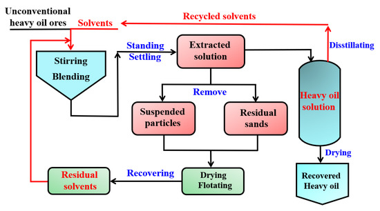 At present, some main separation methods have been used to separate heavy oil from UHO, mainly including pyrolysis [11], hot water-based extraction (HWBE) [12], solvent extraction (SE) [13,14] and reactive extraction (RE) [15]. The pyrolysis method works based on the energy-intensive reaction and high oil content in unconventional oil ores. The pyrolysis of UHO is a process of cracking heavy oil to produce volatiles through the fracture of chemical bonds at high temperature. The pyrolysis process produces gaseous and liquid products, for which the low boiling point components, known as dry gas in the industry, are difficult to condense leaving the high boiling point components to be condensed into liquid products, namely pyrolytic oil. This process is shown in Figure 2 [16]. HWBE mainly uses the penetration of surfactant to reduce the adsorption force of heavy oil on the sand surface before it undergoes floated oil treatment in a hot water environment [17]. Due to the density difference of each component, the separation of heavy oil and sands is realized. The separation processes are shown in Figure 3 [18], and mainly include two stages: heavy oil dissociation and air flotation. SE is based on the principle of ‘‘similar phase solubility” of organic solvents to dissolve the heavy oil components in UHO [19]. The process of separating UHO by SE is shown in Figure 4. RE is based on the reaction between UHO and acid solution to separate heavy oil [20]. The processes of separating heavy oil from UHO by the above methods include two important processes: oil–solid separation and oil–water separation. Clarifying the technical bottlenecks of these two processes will offer significant implications for the exploitation and recovery of UHO.