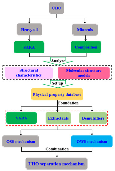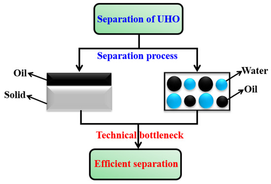 As shown in Figure 5. The oil–solid separation process of UHO is the separation of heavy oil and mineral solid particles. The key technical bottleneck of this process is how to quickly and effectively peel the heavy oil from the surface of mineral solid particles. The oil–water separation process of UHO is the separation of heavy oil and water. In the process of separating UHO by HWBE and RE, the participation of water is involved in different degrees and natural surfactants (asphaltenes, resins, naphthenic acid etc.), amphiphilic (hydrophilic and lipophilic) mineral solid particles in heavy oil. The stable heavy oil–water emulsion phase is formed [21]. The heavy oil–water emulsions will bring a series of problems to the subsequent oil separation and processing processes, such as an increase in processing cost, corrosion of pipelines and equipment, reduction in oil quality, pollution of the environment etc. [22]. Therefore, the question of how to efficiently break heavy oil–water emulsions is not only a universal technical bottleneck in the oil–water separation process of UHO, but also possesses important practical application value in heavy oil exploitation and processing. Next, some methods to solve the technical bottleneck in the process of oil–solid separation and oil–water separation are introduced.