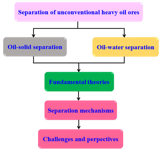 In this review article, as shown in Figure 6. An attempt is made to cover a wide range of research studies of oil–solid separation (OSS) and oil–water separation (OWS) in UHO production processes. First, an overview of the fundamental theories of OSS and OWS are presented. Following that, the research statuses of OSS and OWS mechanisms are reviewed. Eventually, we also share our views on the challenges and perspectives for the research of OSS and OWS in UHO field. This review aims to give comprehensive summaries of OSS and OWS in the UHO production process. To be more focused in its content, this article will not cover the development of organic extractants and chemical demulsifiers, for which interested readers should refer to other recent reviews [34,35,36,37,38].