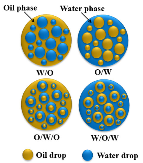 During the process of unconventional heavy oil, heavy oil–water emulsions are inevitably generated. The formation of the oil–water emulsions is due to following three conditions [68,69]. (1) There is an immiscible oil phase (heavy oil) and an immiscible water phase in the system; (2) The oil–water system contains one or more indigenous surface-active components of heavy oil (e.g., asphaltenes, resins and natural surfactants), mineral particles and externally added surfactants. (3) There is the requisite strength of mechanical shear force to make the immiscible oil phase and water phase fully mix and form emulsions. As shown in Figure 8, The emulsions can form in different types: water-in-oil (W/O), oil-in-water (O/W) and multiple emulsions, such as (oil-in-water)-in-oil (O/W/O) or (water-in-oil)-in-water (W/O/W) emulsions [70]. Theoretically, the emulsions are thermodynamically unstable, as a result of the excess energy of the interfaces. However, the heavy oil–water emulsions are kinetically stable for a long period of time, from several hours to several months or even longer. In addition, these emulsions will also significantly reduce the yield and quality of heavy oil [68].