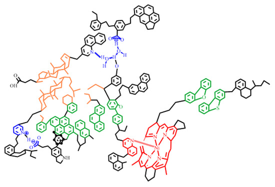 The molecular structure of asphaltene has been the subject of many research studies [81,82,83,84,85]. In early works, two dominant structure models were accepted to describe the molecular structure of the asphaltene: namely, the “island” and the “archipelago” models [86,87]. The “island” model is one in which there is only one fused aromatic ring system in the structural unit of the asphaltene molecule, with the fused aromatic ring as the center, multiple cycloalkyl rings are combined with it, and alkyl side chains with or without heteroatoms are connected with it. Its average molecular weight is about 750 g/mol. This “island” model possesses seven fused aromatic rings, and heteroatoms and metal elements in the form of porphyrins also exist in the fused aromatic ring system [81,88,89]. However, there are several similar “island” model structures in the structural units of “archipelagic” asphaltene molecules, and these structural units are connected by alkyl chains. The number of fused aromatic rings in the “archipelagic” model structure is far less than seven [90,91]. The “Yen–Mullins” model is considered one of the most acceptable molecular structures of asphaltenes (Figure 9) [92]. At present, the most likely molecular structure model of asphaltene to have been proposed by researchers is shown in Figure 10. The difference between this asphaltene molecular structure model and the above model is that the influence of metal atoms and electric charges on molecular structure characteristics of asphaltene is considered [93].