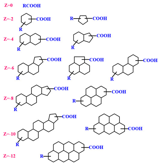 Typical structures of naphthenic acids with different carbon numbers and a varying degree of condensation, R represents the hydrocarbon tails. Reprinted with permission from Ref. [108]. Copyright 1991, copyright the American Chemical Society.