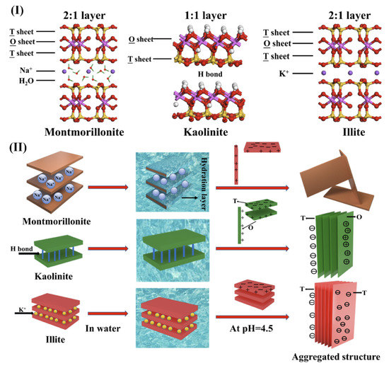 Schematic of the structures of clay minerals (I) and schematic illustration of different behaviors derived from various structures of clay minerals (II). Reprinted with permission from Ref. [116]. Copyright 2020, copyright the American Chemical Society. More details on Copyright and Liscensing are available via the following link: https://pubs.acs.org/.