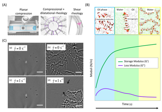 The rheological properties are also important interface characteristics of asphaltene interfacial films at the oil–water interface. Asphaltenes adsorb to oil–water interfaces and form continuously rigid interfacial films on the order of 2–10 nm thick that stabilize heavy oil–water emulsions and resist deformation due to their viscoelastic properties by acting as physical barriers that can sterically inhibit droplet coalescence (see Figure 15) [149,150,151,152,153,154,155]. It is generally accepted that asphaltene adsorption leads to the formation of elastic skins around water droplets [156,157,158]. The viscoelastic properties of asphaltene-stabilized interfacial films depend on oil composition, physicochemical properties of asphaltenes, acidity, surface coverage (encoded in surface aging), time scale/frequency susceptibility to deformation, the dynamics of the fluids that surround the interface, and the interactions between adsorbed molecules [159,160,161,162,163]. As both surface elasticity and viscosity take place upon interfacial deformation, the mechanism driving molecular motion, configuration, orientation, and interactions influence the mechanical and rheological properties of the asphaltene stabilized interfacial films [164,165]. For example, Liyuan Feng et al. [166] investigated the impact of sodium citrate (Na3Cit) on the oil–water interface containing asphaltene. A rheometer equipped with a double wall ring (DWR) system was utilized to determine the shear rheological response of asphaltene film as a function of the subphase solution salinity. These results collectively suggest that Na3Cit–asphaltene interactions result in a looser and more elastic asphaltene interfacial network with a slow formation and reduces the adhesion between the two interfaces, all of which are most likely the consequence of increased electrostatic repulsion between asphaltene interfacial nanoaggregates. At present, numerous investigations have focused on understanding the viscoelastic behavior of asphaltene interfacial films using interfacial rheological measurements (e.g., shear, dilatational, and mixed-flow) and found that interfacial films’ properties vary with bulk concentration, aging time, solvent quality, and asphaltene origin (see Figure 16A) [88,150,167,168,169,170]. For example, as seen in Figure 16B, both the shear and dilatational elastic storage moduli increase with aging time, which is believed to be caused by interfacial rearrangement, crowding, and stronger intermolecular associations of asphaltenes in the interfacial films. The microstructure of asphaltene films influences interfacial shear thinning, fracture, and yielding behavior, where elastic films, multilayer aggregates, surface wrinkles, and dispersed aggregates are shown in Figure 16C.