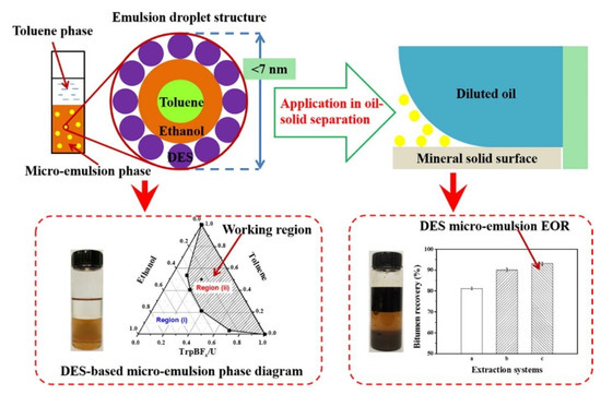 At present, in order to solve the bottleneck problem of low oil–solid separation efficiency in the process of UHO separation, the additive assisted solvent extraction is often used to improve the oil–solid separation efficiency. For example, Xingang Li et al. [23] used an ionic liquid (IL) with low viscosity, 1-ethyl-3-methyl imidazolium tetrafluoroborate ((Emim) (BF4)), to enhance bitumen recovery from oil sands by solvent extraction using a composite solvent of n-heptane and acetone. Their results demonstrate that (Emim) (BF4) increased the bitumen recovery by up to 95% at room temperature, with much less fine clay in the recovered bitumen than those using solvent extraction without IL, and with no organic residue observed in the spent sands. Hong Sui et al. [24] synthesized a novel form of process aid, switchable-hydrophilicity tertiary amines (SHTAs, such as triethylamine, N,N-dimethylcyclohexylamine, N,N-dimethylbenzylamine) in their hydrophilic forms, and applied them to the task of enhancing heavy hydrocarbon recovery from oil sands ores during solvent extraction. It has been observed that the secondary extraction rate of asphalt is 98%, which is 5% higher than that of pure solvent extraction. At the same time, the solid entrainment of asphalt oil and the solvent residue of extracted residual sand are greatly reduced. Yi Lu et al. [25] used CO2-responsive surfactants to enhance the overall heavy oil recovery by switching their interfacial activity to the desired state in each stage. In addition, physical demulsification, biological demulsification and chemical demulsification methods are often used for the separation of oil–water emulsions [26,27]. This is because chemical demulsification, as an economic and efficient demulsification method, has the advantages of high demulsification efficiency, low cost and wide application range [28]. Therefore, the chemical demulsification method is often used to separate heavy oil and water [29,30]. This method mainly added chemical demulsifier with strong interfacial activity into emulsions. Using the interaction between chemical demulsifier and emulsifier on an oil–water interface can change the physicochemical properties of the oil-water interface [31], further destroy the interfacial films, accelerate the aggregation, coalescence and sedimentation processes of emulsion droplets, and finally achieve the purpose of demulsification [32]. For example, Jun Ma et al. [33] successfully synthesized a novel aliphatic alcohol nonionic polyether (MJTJU-2) by esterification and polymerization. It was found that this new polyether is efficient in rapidly demulsifying the most stable heavy oil–water emulsion (interfacially active asphaltene (IAA)-stabilized emulsions) with almost complete dehydration (>97%) of the emulsions achievable in less than 15 min at 60 °C using 400 ppm of MJTJU-2. To sum up, the separation mechanisms of oil–solid separation and oil–water separation in unconventional heavy oil ore production processes are still unclear, and comprise a key scientific problem leading to the low efficiency of oil–solid separation and oil–water separation.