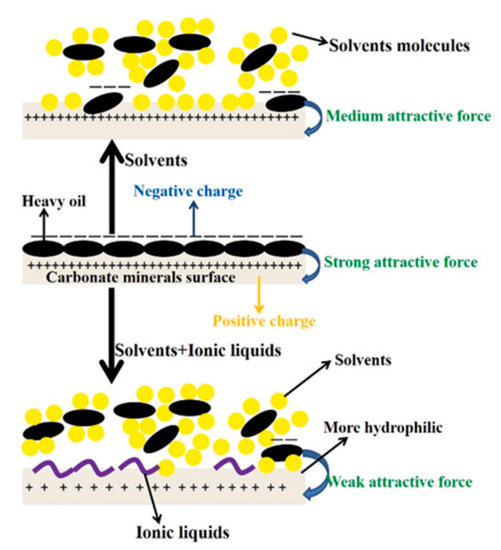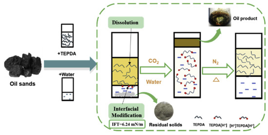 At present, in the separation process of UHO, the research on the mechanism of oil–solid separation has been reported. For example, as shown in Figure 17, Zisheng Zhang et al. [43] synthesized a novel amino acid ionic liquid-based deep eutectic solvent (TrpBF4/U) by using L-tryptophan, fluoroboric acid and urea. It is found that the TrpBF4/U could form non-aqueous surfactant-free micro-emulsion through mixing with ethanol and toluene. The size of the micro-emulsion droplets was less than 7 nm and was dependent on the concentration of toluene. This newly prepared TrpBF4/U-based micro-emulsion was applied to extract the extra-heavy oil from UHO. Results showed that the oil recovery was enhanced by at least 11% compared with that without the TrpBF4/U micro-emulsions. The mechanism of the oil–solid separation was mainly ascribed to the interfacial alteration at the oil and mineral surfaces by the TrpBF4/U, including lowering the interfacial tension and increasing solid wettability. Jinjian et al. [173] further puts forward the ionic-liquid-enhanced solvent extraction mechanism in the oil–solid separation processes of UHO. As shown in Figure 18, the ionic liquids effect could be summarized for two aspects, namely, the heavy oil internal property alteration and interface property alteration. On the one hand, ionic liquids could alter the heavy oil internal property. The ionic liquids could increase the heavy oil C/H ratio, decrease the heavy oil viscosity, and increase the heavy components (asphaltenes, resins) content. On the other hand, ionic liquids could effectively alter the interface property (oil-solid interface and oil-water interface). Ionic liquids could increase the rock surface hydrophilicity and decrease the oil-water interfacial tension. In addition, the ionic liquids would alter the surface charge of rock surface and heavy oil surface. The ionic liquids can further effectively decrease the heavy oil and the CaCO3 charges absolute value, and then the heavy oil and CaCO3 surface attractive force would decrease. Therefore, the oil solid interface force would decrease. Xingang Li et al. [42] used a switchable solvent with a diamine structure called N, N, N′, N′-tetraethyl-1, 3-propanediamine (TEPDA) to extract heavy oil from UHO. This solvent can switch between its hydrophilic and hydrophobic states with the addition or removal of CO2, respectively. It founds that TEPDA can be applied as an organic solvent and can be ionized in water to form cations. TEPDA was proven to perform well with water in separating heavy oil from a carbonate solid surface, resulting in over 10% additional oil recovery. A mechanistic study showed that in this aqueous/non-aqueous hybrid process, TEPDA acts mainly as a solvent in softening and dissolving heavy hydrocarbons (dissolution effect). Meanwhile, a small amount of ionized TEPDA in the aqueous phase acts as a surface-active material accumulating at the oil-water and water-solid interfaces (interfacial modification). In addition, Yi Lu et al. [25] used CO2-responsive surfactants to enhance oil–solid separation in UHO. The mechanistic study showed that CO2-responsive surfactants were investigated to enhance the overall heavy oil recovery by switching their interfacial activity to the desired state in each stage. The surfactants at interfacially active state greatly enhanced the separation of heavy oil from hosting solids, as demonstrated by measuring contact angle and oil liberation using a custom-designed on-line visualization system (see Figure 19).