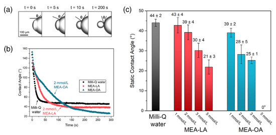 (a) Snapshots of a high viscosity oil droplet receding on a silica surface in Milli-Q water; (b) Dynamic contact angle in the first 300 s; and (c) Static contact angles in different aqueous solutions. a The oil drop detached from the silica surface in 5 mmol/L MEA-OA solution, thus showing as a contact angle of zero degree. Reprinted with permission from Ref. [25]. Copyrights 2021, copyright Wiley. More details on Copyright and Liscensing are available via the following link: https://aiche.onlinelibrary.wiley.com/.