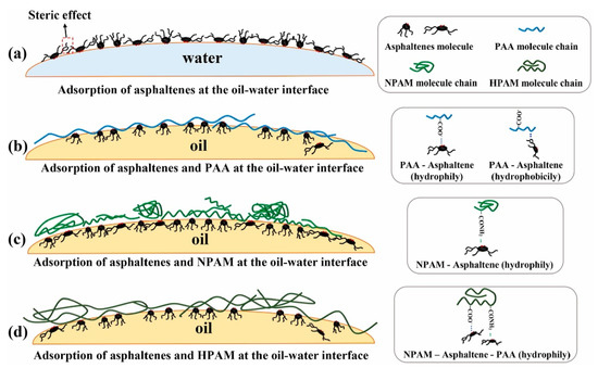 Schematic diagram of interaction on the oil–water interface. Formation of asphaltenes interfacial films (a). Interfacial films of synergistic interaction between PAA and asphaltenes (b). Interfacial films of synergistic interaction between NPAM and asphaltenes (c). Interfacial films of synergistic interaction between HPAM and asphaltenes (d). Reprinted with permission from Ref. [189]. Copyright 2022, copyright the Elsevier. More details on Copyright and Liscensing are available via the following link: https://www.sciencedirect.com/.