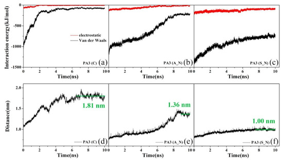 The interaction energies between asphaltenes (a) PA3 (C), (b) PA3 (A_N), (c) PA3 (S_N) and silica as a function of simulation time; average distance between center of mass (COM) of asphaltenes, (d) PA3 (C), (e) PA3 (A_N), (f) PA3 (S_N) and silica as a function of simulation time. Reprinted with permission from Ref. [200]. Copyright 2019, copyright the Elsevier. More details on Copyright and Liscensing are available via the following link: https://linkinghub.elsevier.com/.