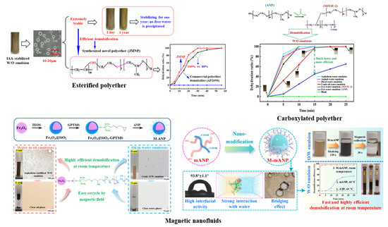 - Zhou, J.; Zhang, X.; He, L.; Sui, H.; Li, X. Nano-modification of carboxylated polyether for enhanced room temperature demulsification of oil–water emulsions: Synthesis, performance and mechanisms. J. Hazard. Mater. 2022, 439, 129654. [Google Scholar] [CrossRef]