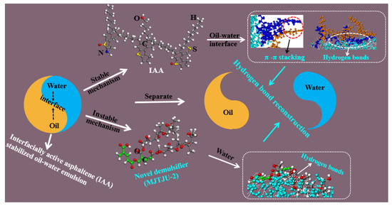 In the separation processes of UHO, oil–water separation (or demulsification) is the follow-up procedures of oil–solid separation. Chemical demulsification is the most common method in the exploitation and production of heavy oil [174,175,176,177,178]. The key to this method is to use chemical demulsifier with strong interfacial activity to realize oil–water separation. Therefore, understanding the mechanism of oil–water separation is the premise to realize the efficient demulsification of heavy oil–water emulsions.
