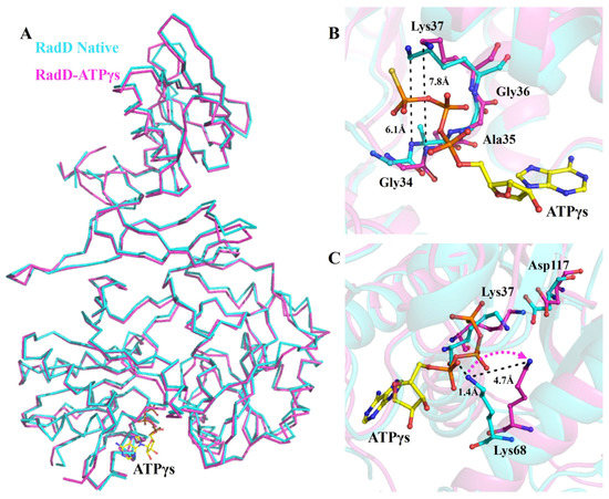 Conformation changes in RadD due to ATP binding. (A) Superposition of the structures of apo-RadD and RadD/ATPγS, shown as ribbon. (B) Walker A motif expands slightly when RadD binds an ATP, shown as sticks. (C) Compared with the structure of apo-RadD, Lys68 shifts away due to the RadD binding the ATP molecule, shown as sticks. Apo-RadD is shown in cyan and RadD/ATPγS in magenta.