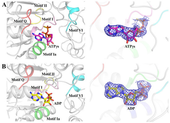 However, in the structure of the RadD/ATP complex, an ADP molecule was at the same position as ATPγS (Figure 2A,B). RadD/ATP crystals were obtained by incubating and co-crystallizing 5 mg/mL RadD and 5 mM ATP with 5 mM Mg2+. The electron density of the structure showed only the density of the ADP molecule and no density of γ-phosphate, indicating that ATP was hydrolyzed into ADP during crystallization.