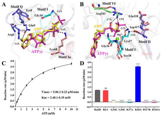 The ATPase activity of RadD. (A,B) Residues involved in interface interactions between the RadD and ATP molecule. The residues are shown as sticks and the Mg2+ ion as a green sphere. (C) The ATPase activity shows Vmax = 5.06 μM/min and Km = 3.48 mM. (D) The ATPase activity assays of RadD and mutants at a concentration of 0.375 μM and ATP at a concentration of 1 mM. Error bars indicate the S.D. of at least three independent experiments, **** means p-value < 0.0001.