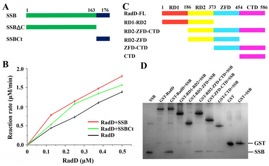 Interaction between RadD and SSB. (A) Schematic of SSB domains. (B) SSB or SSBct increases the ATPase activity of RadD. (C) Schematic of RadD domains. (D) Assays of RadD and SSB interactions by GST pull-down. SDS-PAGE is stained using Coomassie Blue.