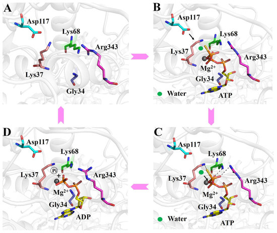 Our data support that the ATP hydrolysis process of RadD is divided into the following steps. The phosphate tail of ATP entered the active pocket, and Gly34, Gly36, and Lys37 on the P-loop expanded slightly to accommodate the size of the phosphate group and cooperated with Arg343 on helicase feature motif VI to bind ATP’s β- and γ-phosphoric acids, where hydrogen bonds are formed. Motif Q formed a “groove” structure, which bound the adenine of ATP (Figure 5B). The Walker B motif was close to the ATP molecule, and Ser38 interacted with the Mg2+ ion. Asp117 polarized the attack water molecules near the γ-phosphoric acid and initiated a nucleophilic reaction to form a transition state (Figure 5B,C), and then the Walker B motif returned to its original position. Lys37 and Asp117 played an important role in stabilizing the transition state. The chemical bond between γ- and β-phosphoric acids was broken, and the intermediates further became the final products of ADP and phosphoric acid (Figure 5D). ADP exited from the active pocket. The Walker A motif and the relative positions of key amino acids Lys37, Lys68, and Arg343 were slightly tightened, and the active pocket returned to its original conformation (Figure 5A).