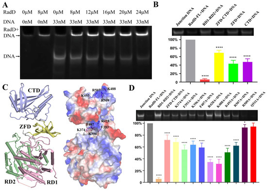 RadD interaction with ssDNA dt 100 was reported by Stefanie. H.C. in 2016 [11]. Here, our EMSA assay results indicated that the RadD displayed a high affinity for branched DNA similar to its homologous protein RecQ [24,25] (Figure 6A). Following the structure of RadD/ATP, we designed several truncations to explore the interaction region between RadD and DNA. The results showed that the binding amount by RD1-RD2 was lower (6.0%) compared with that of wild-type (100%), indicating that RD1 and RD2 cannot bind branched DNA. The binding amount by ZFD-CTD, ZFD, and CTD to DNA were 69%, 43%, and 47%, respectively (Figure 6B). The above data verified that the ZFD and CTD of RadD were important binding sites for branched DNA. RD1 and RD2 did not bind to DNA, but their ability to help ZFD and CTD in forming the rigid structure of RadD improved the binding to DNA.