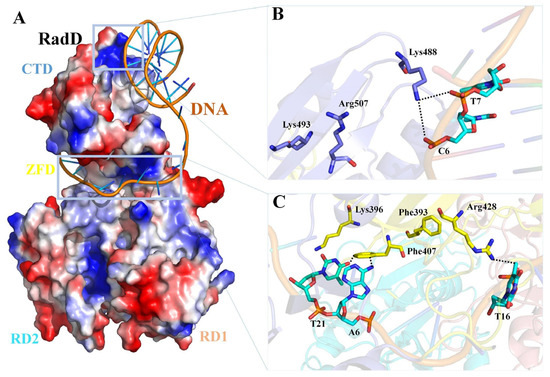 Predictive model of the RadD/DNA complex. (A) Surface potential diagram of RadD binding branched DNA. The blue area is shown as the positive charge and the red area is the negative charge, and the branched DNA is shown as a cartoon. (B) Interface residues mediating interactions between the RadD-CTD and branched DNA. (C) Interface residues mediating interactions between the RadD-ZFD and branched DNA. CTD is shown in blue, ZFD in yellow, DNA in orange, and the bases in cyan.