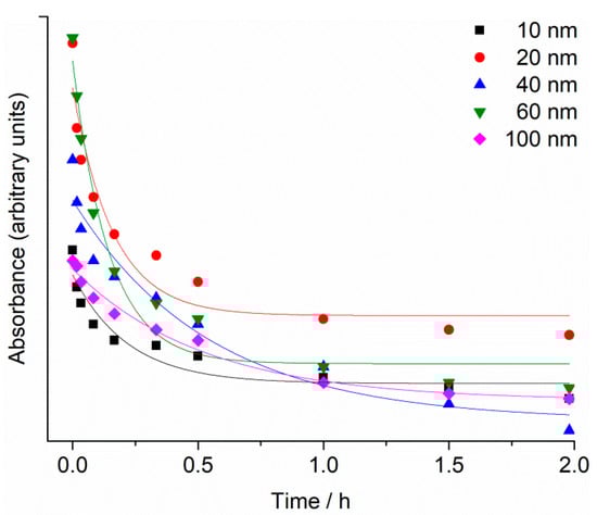 Figure 1. Temporal change in SPR maximum absorbance for 10, 20, 40, 60 and 100 nm AgNPs (1 mg L−1) in FSW.