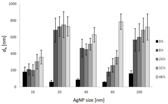 Figure 2. Hydrodynamic diameters (dh) and standard deviations of differently sized AgNPs in FSW over 48 h (c = 1 mg L−1) based on volume size distribution.