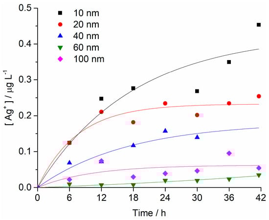 The changes in concentration of Ag+ ions in FSW for different AgNPs sizes (starting concentration of 1 mg L−1) over time were determined by high-resolution inductively coupled plasma mass spectrometry. The fastest initial rate of increase in Ag+ ion concentration was noted for 10 nm AgNPs, which also showed the greatest ion concentration of 0.45 mg L−1 after 42 h. A similar rate of ion concentration increase was also observed for 20 nm AgNPs over the first 6 h, after which the rate of ion release slowed, with 25% of the total AgNPs mass eventually present as silver ions after 42 h. AgNPs with diameters of 40, 60 and 100 nm were noted to release Ag+ ions at progressively slower rates with increasing size. For example, after 42 h, the 60 nm AgNPs had released 4%, whereas 100 nm AgNPs released 5% of their mass as Ag+ ions (Figure 3).