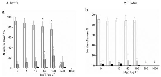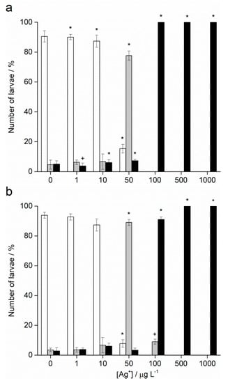 Figure 4. Percentage of normal (white bars) and developmentally delayed (grey bars) larvae, and undeveloped embryos (black bars) (±SD) of (a) A. lixula and (b) P. lividus exposed to various concentrations of Ag+ ions. Significance levels: + p < 0.05 and * p < 0.001.