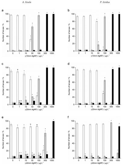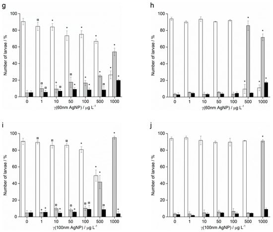 Figure 5. Percentage of normal (white bars) and developmentally delayed or defective (grey bars) larvae, and undeveloped embryos (black bars) (±SD) of urchins A. lixula (left bar charts) and P. lividus (right bar charts) exposed to AgNPs of diameter (a,b) 10 nm, (c,d) 20 nm, (e,f) 40 nm, (g,h) 60 nm, and (i,j) 100 nm. Significance levels: + p < 0.05, ¤ p < 0.01 and * p < 0.001.