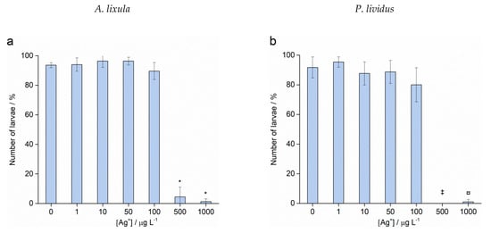 39. Choi, S.; Kim, S.; Bae, Y.J.; Park, J.W.; Jung, J. Size-dependent toxicity of silver nanoparticles to Glyptotendipes tokunagai. Environ. Health Toxicol. 2015, 30, e2015003. [Google Scholar] [CrossRef]