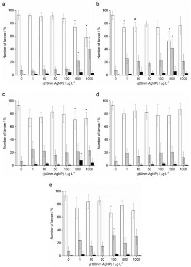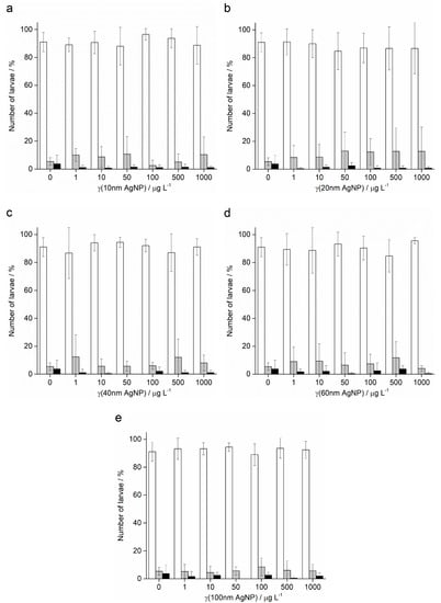 Figure 9. Offspring quality of urchin P. lividus whose sperm was pre-treated for 1 h with different sizes of AgNPs: (a) 10 nm, (b) 20 nm, (c) 40 nm, (d) 60 nm and (e) 100 nm. White columns indicate normally developed larvae and gray columns developmentally delayed or defective larvae, while black columns show embryos with arrested development (±SD).