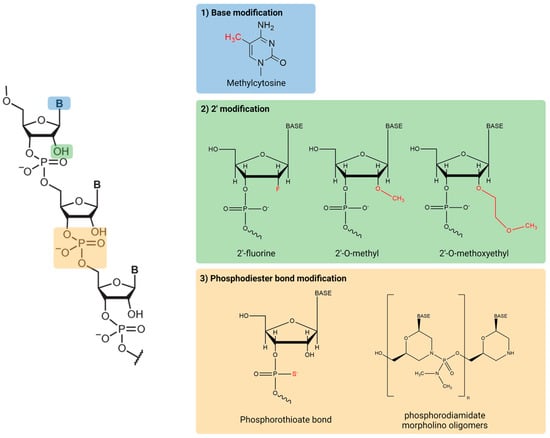 Native oligonucleotides are rapidly degraded by nucleases and have a low affinity to proteins present in the plasma, resulting in their rapid elimination [15,16]. To overcome these issues, chemical modifications have been introduced into bases, RNA backbones, or sugar moieties (Figure 2). First, base modification is often applied to induce stronger Watson–Crick base pairing. This method also increases the thermal stability of duplexes formed between oligonucleotides and their target RNA [17]. However, higher affinity may increase the potential of off-target effect, contributing adverse effects. Additionally, modified pyrimidines have been shown to hinder siRNA-mediated silencing as they are relatively bulky, preventing proper attachment of the RNA-induced silencing complex (RISC) [18]. Second, the ribose modification in RNA is widespread method to improve stability against nuclease degradation, resulting in an increase in its pharmacokinetic half-life [19]. The most widely modified position in sugar moieties is their 2′-carbon. Common modifications include 2′-O-methyl (2′-O-Me), 2′-fluoro RNA (2′-F-RNA), and 2′-O-methoxyethyl (2′-O-MOE). Third, the phosphodiester linkages of the nucleic acid backbone are another target for modification because nucleases can cleave the linked phosphodiester bonds. The most common modification in the nucleic acid backbone is the phosphorothioate (PS) linkage, in which a non-bridging oxygen is substituted with sulfur. The advantage of the PS linkage is not only resistance against nuclease degradation, but also increased tissue uptake [20,21]. Another common modification for ASOs is the phosphorodiamidate morpholino oligomer (PMO), which contains a modified sugar of morpholine rings connected by phosphorodiamidate linkages [22]. PMO is resistant to various enzymes in biological fluids, enhancing the biological stability and efficacy of the RNA therapeutic [22].