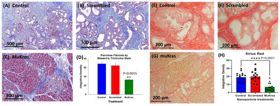 During pancreatic carcinogenesis, the normal parenchyma of the pancreas is replaced with the precancerous PanIN lesions and dense fibrosis in the pancreatic extracellular matrix (ECM) or tumor microenvironment (TME). This characteristic desmoplastic reaction found in the pancreas of the KC mice and also in human pancreatic cancer is due to the activation of pancreatic stellate cells and fibroblasts [30]. The pancreas from control KC mice (Figure 2A) and from the KC mice treated with CCK-BR targeted NPs loaded with a scrambled siRNA (Figure 2B) exhibited marked intra-pancreatic fibrosis as shown in the representative images of sections stained with Masson’s trichrome. KC mice treated for 4 months with targeted NPs loaded with muKras siRNA not only had fewer high grade PanIN lesions and preservation of pancreatic acinar cells, but also exhibited significantly less fibrosis within the pancreas extracellular matrix (Figure 2C). The amount of fibrosis was analyzed by integrative density and demonstrated to be about half the amount as that in the pancreas of control and scrambled siRNA treated mice (Figure 2D; p = 0.0015). Confirmation of collagenous fibrosis staining in the pancreas microenvironment was performed with Sirius red staining. Similar to the Masson’s trichrome stains, pancreata of control mice (E) and scrambled siRNA-treated mice (F) show significant staining consistent with increase fibrosis. In contrast, pancreata of mice treated with the muKras siRNA loaded NP had less Sirius red staining (G). Densitometry of images from each treatment group (H) revealed less fibrosis in pancreas of the muKras-treated mice (p < 0.0001).
