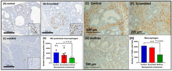 The immune cell signature of the pancreas ECM was markedly changed in the muKras siRNA NP-treated mice as demonstrated by a decreased number of M2-polarized arginase positive macrophages. The immunosuppressive M2-polarized macrophages are abundant in the pancreatic tissue of control KC mice (Figure 3A) and also in the pancreas of mice treated with the NP loaded with scrambled siRNA (Figure 3B). However, fewer M2-polarized arginase positive macrophages were found in the pancreas sections of mice treated with the NPs loaded with the muKras siRNA (Figure 3C). The number of M2 polarized macrophages were quantified and significantly less in the pancreas of mice treated with the targeted NP loaded with muKras siRNA (p = 0.02; Figure 3D). These changes in the pancreas ECM rendered the environment less carcinogenic. In order to confirm the immunoreactivity was associated with tissue macrophages, we also performed immunoreactivity with a F4/80 that reacts to murine macrophages. An abundance of macrophages are identified in the pancreas microenvironment of control mice (Figure 3E) and also in the pancreas of scrambled siRNA NP-treated mice (Figure 3F). Significantly fewer F4/80+ tissue macrophages were found in the pancreas of mice treated with the muKras siRNA (Figure 3G). Quantitative analysis of macrophage density confirmed less macrophages were present in the pancreas of mice treated with the muKras siRNA NPs (Figure 3H; p < 0.0001).