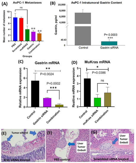 The following supporting information can be downloaded at: https://www.mdpi.com/article/10.3390/ijms24010752/s1, Figure S1. Confirmation of AsPC-1 tumor metastases by histology; Figure S2. Mouse intestine; Figure S3. Mouse stomach; Figure S4. Mouse liver; Figure S5. Mouse kidney; Figure S6. Mouse spleen; Table S1: Sequences of the siRNAs loaded to nanoparticles; and Table S2: Primers used for qRT-PCR.