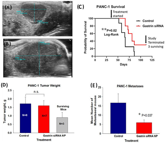 Treatment of mice with a large PANC-1 tumor burden and late disease with a NP loaded with GAST siRNA still improves survival and decreases metastases. (A) A representative ultrasound image confirms the presence of a PANC-1 tumor one week after inoculation. (B) A representative abdominal ultrasound of a mouse is shown 5 weeks after PANC-1 inoculation and at the initiation of therapy with an extensive large tumor. (C) Kaplan Meier survival curve shows improved survival benefit (p = 0.02) in mice treated with NP loaded with GAST siRNA. Top arrow points to the time when the treatment was started. The second arrow on the right points to the time when the study was terminated and to the N = 3 surviving mice in the GAST siRNA-treated group over 1 month after the last control mouse had died. (D) Final tumor weights in grams are shown for the N = 8 control mice and GAST siRNA NP- treated mice that died during the study. The tumor weights of the N = 3 GAST siRNA NP treated surviving mice are shown. (E) The mean number of metastases counted and confirmed histologically was significantly less in the GAST siRNA -treated mice compared to control (p = 0.037). * p < 0.05; ** p = 0.02.