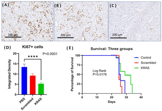 Effects of targeted NP loaded with muKras and WT-Kras siRNA on growth and survival of mice bearing mT3 syngeneic orthotopic pancreatic tumors. (A) Ki67 immunohistochemistry staining of a representative control tumor shows abundant proliferating cells. (B) Representative image from a tumor of a scrambled-siRNA NP treated mouse, Ki67 immunohistochemistry staining. (C) Representative image from an mT3 tumor of a mouse treated with the NP loaded with siRNA for muKras and WT-Kras shows fewer Ki67 immunoreactive cells. (D) Quantitative analysis of all the tumors reacted with the Ki67 antibody shows fewer immunoreactive cells in the mice treated with the muKras and WT-Kras siRNA compared to controls (p < 0.0001). (E) Kaplan Meier survival curves shows a significant survival benefit in mice treated with the NP loaded with Kras siRNA compared to controls and those treated with the scrambled siRNA (p = 0.0178). **** p < 0.0001.