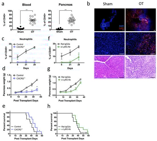 We first generated orthotopic PDAC tumors in mice by intra-pancreatic injection of tumor cells (1242 L) derived from KRASG12D/+; Trp53R172H/+; PDX-cre (KPC) mice [20]. These 1242 L tumor cells were transfected to stably express luciferase, which permits tracking of tumor progression over time. An increase in pancreas weight over time confirmed successful implantation and growth of tumor cells (Supplementary Figure S1a). Flow cytometry revealed a significant increase in Ly6G+ neutrophils in the blood (51.1% vs. 6.4%) and pancreas (25.1% vs. 1.3%) of orthotopic transplanted (OT) mice compared to sham, non-tumor bearing controls (Figure 1a, Supplementary Figure S1b,c). Furthermore, immunofluorescence (IF) staining confirmed that a large number of neutrophils infiltrated the pancreas of OT mice while little-to-no neutrophils were observed in the pancreas of sham controls (Figure 1b).