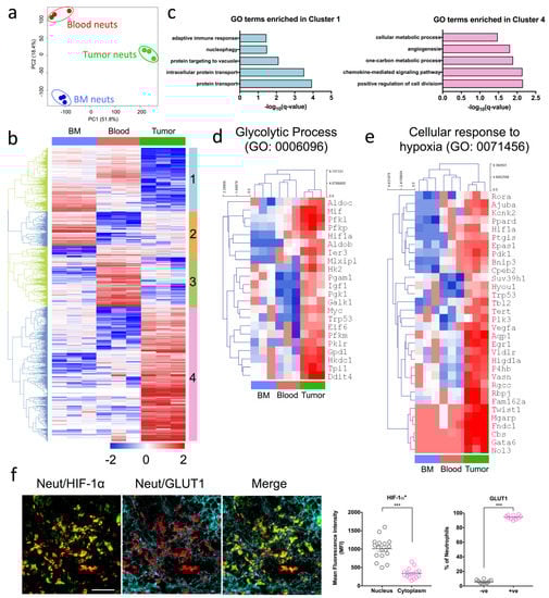 Pro-tumoral neutrophils exhibit a highly glycolytic signature and are adapted to a hypoxic tumor microenvironment (a–e) Bone marrow (BM), blood and tumor neutrophils were sorted based on their expression of Dapi-CD45 + Lin(CD3/B220/NK1.1) − Ly6G + Ly6C+ (orthotopic transplanted [OT] n = 5 mice pooled, three independent experiments). Hierarchical clustering and principal component analysis (PCA) were performed with log2–transformed values. (a) PCA plots of transcriptomic data of BM, blood and tumor neutrophils respectively. (b) Heat map of the differentially expressed genes selected with Benjamini–Hochberg adjusted p-values < 0.05. Four gene clusters (1 to 4) were manually defined and exported for gene ontology (GO) biological process analysis. (c) GO biological process terms enriched in clusters 1 (left) and 4 (right). (d,e) Expression of genes with row/gene-based z-score values (log2 FPKM) of cluster 4-associated genes across all sorted populations encoding (d) GO: 0006096—Glycolytic process and (e) GO: 0071456—Cellular response to hypoxia. (f) Representative immunofluorescence staining of pancreas sections from OT mice stained with Dapi (blue), S100A9 (red) neutrophil marker, and HIF-1α (green) and GLUT1 (cyan) glycolytic markers. Immunofluorescence images shown are representative images of n = 3 mice, and 10–15 fields of view. Scale bar = 100 µM. Scatter plots represent the mean fluorescence intensity (MFI) of HIF-1α+ neutrophils staining in the nucleus and cytoplasm, and percentage of GLUT1 expressing neutrophils in the tumor. Data represent the means ± SEM, *** p < 0.001 by unpaired Student’s t-test with a 95% confidence interval.
