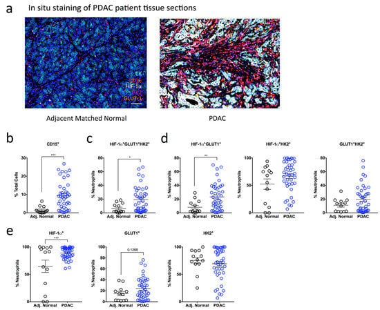 Similar to our mouse in vivo data, we observed a significant 6.2-fold increase in infiltrating CD15+ neutrophils in patients with PDAC (9.44%) compared with adjacent matched normal tissue sections (1.52%) (Figure 3b). Given the up-regulation of glycolytic and hypoxia genes involved in our mouse model of PDAC (Figure 2d,e), we were interested to determine whether the CD15+ neutrophils in our PDAC patients co-expressed hypoxia and glycolytic markers (HIF-1α + GLUT1 + HK2+). Indeed, PDAC tumors showed a significant increase in the proportion of HIF-1α + GLUT1 + HK2+ neutrophils (19.26%) compared to adjacent matched normal tissue (6.31%) (Figure 3c). We then wanted to determine whether co-expression of two markers is sufficient to differentiate PDAC tumor tissue from adjacent matched normal tissue and assessed the proportion of neutrophils that were positive for two glycolytic markers. Here, only HIF-1α + GLUT1+ neutrophils were proportionally increased in PDAC tumor tissue (23.21%) compared to adjacent matched normal tissue (8.17%), while the proportion of HIF-1α + HK2+ and GLUT1 + HK2+ neutrophils was similar between the two groups (Figure 3d).