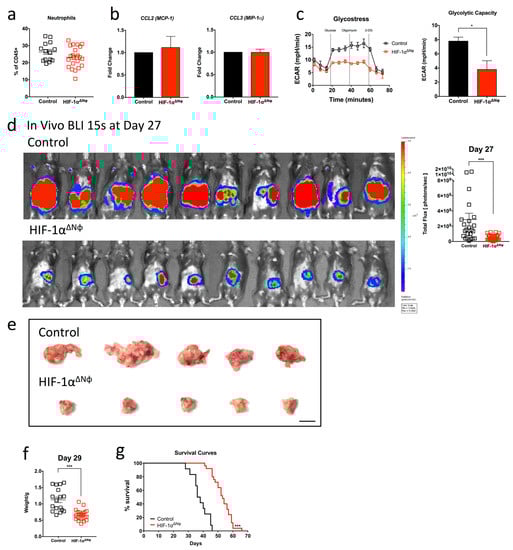 Neutrophil-specific HIF-1α deletion significantly attenuates tumor burden (a) Pancreatic tumors from tumor-bearing HIF-1αΔNφ orthotopic transplanted (OT) and littermate HIF-1αfl/fl control OT mice were harvested at day 28 post transplantation and the myeloid cell populations were assessed by flow cytometry. The scatter plot of infiltrating neutrophils (Dapi-CD45 + Lin(CD3/B220/NK1.1) − Ly6G + Ly6C+) are plotted as a percentage of total CD45+ cells, from HIF-1αΔNφ OT mice (red clear) and littermate HIF-1αfl/fl controls (black clear) (OT n = 23, sham n = 14; of three independent experiments, pooled). (b) Pancreatic neutrophils were sorted from HIF-1αΔNφ mice and littermate controls and gene expression of CCL2 and CCL3 was assessed by quantitative PCR (n = 3 mice, three independent experiments). (c) Sorted neutrophils from HIF-1αΔNφ OT and control OT mice were rested at 37 °C for 1 h and assessed for their glycolytic capacity by live metabolic flux assay. A representative Seahorse extracellular acidification rate (ECAR) trace of HIF-1αΔNφ OT neutrophils (red) compared with control OT neutrophils (black) is shown (left). The glycolytic capacity (right) was calculated from the Seahorse ECAR trace (n = 3–5 mice pooled per group, three independent experiments). (d) Orthotopic tumors from HIF-1αΔNφ OT and control OT mice were monitored in vivo over time by bioluminescent imaging (BLI; left). The total flux (right) on day 27 post transplantation was calculated from the BLI image (control, n = 25; HIF-1αΔNφ, n = 34, three independent experiments pooled). BLI images were acquired at a 15-s exposure, and the color scale was set to a lower limit of 3 × 106 and an upper limit of 5 × 107 photons/sec. (e) Representative images of HIF-1αΔNφ OT and control OT mice tumors. (f) Tumors were harvested on day 27 post transplantation and weighed. Scatter plot of orthotopic tumor weights from HIF-1αΔNφ OT (red clear) and age-matched OT controls (black clear) (HIF-1αΔNφ n = 24, controls n = 17; of four independent experiments pooled). (g) Kaplan–Meier survival analysis of HIF-1αΔNφ OT mice (n = 25) compared with littermate HIF-1αfl/fl control OT mice (n = 12). Data represent the means ± SEM, * p < 0.05; *** p < 0.001 by unpaired student’s t-test with a 95% confidence interval.
