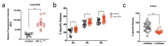 Given that HIF-1αΔNφ mice showed reduced tumor progression kinetics, we explored how HIF-1αΔNφ neutrophils may have contributed to active anti-tumoral immunity. Reactive oxygen species (ROS) have a known role in anti-tumoral immunity [29], and one of the main neutrophil effector functions is oxidative burst [30]. We therefore hypothesized that the reduced tumor burden in HIF-1αΔNφ mice may be due, in part, to increased ROS production. Indeed, we observed that tumor-infiltrating HIF-1αΔNφ neutrophils produced higher levels of intracellular ROS compared to HIF-1α-sufficient neutrophils (Figure 5a). To determine whether the increased production of ROS correlated with enhanced neutrophil cytotoxic ability, we performed a cytotoxic assay using pancreatic neutrophils isolated from OT HIF-1αΔNφ mice and littermate controls and incubated them with the 1242 L tumor cells that were used to produce the OT model. Remarkably, we observed a significant increase in the cytolytic activity of HIF-1αΔNφ neutrophils at a 10:1 effector:target cell ratio at all time points (Figure 5b). Pre-treatment of HIF-1αΔNφ neutrophils with N -acetyl-L-cysteine (a ROS inhibitor) before the cytotoxic assay resulted in ~27% decrease in tumor cell lysis (Figure 5c).