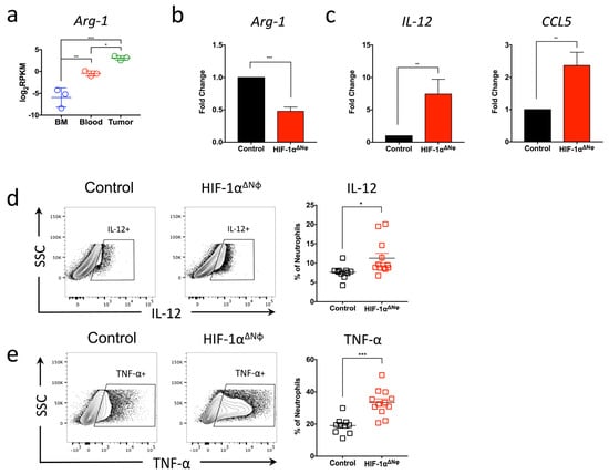 In addition to the direct anti-tumoral effects on neutrophils observed in HIF-1αΔNφ mice, our transcriptomic analysis revealed a down-regulation of the adaptive immune response (GO:0002250) (Figure 2c). This effect could be due to tumor neutrophils exhibiting a more immunosuppressive phenotype. Indeed, we observed that the expression of arginase-1 (Arg-1) was significantly up-regulated in tumor compared to blood and bone marrow neutrophils (Figure 6a). Arg-1 is a well-characterized immuno-suppressor, and a critical regulator of both innate and adaptive immunity [31]. In line with this, transcript analysis revealed that the expression of Arg-1 was significantly down-regulated in HIF-1αΔNφ neutrophils compared to WT OT neutrophils, suggesting that HIF-1αΔNφ neutrophils may be less immunosuppressive (Figure 6b). To address if this hypothesis was indeed the case, we assessed the production of cytokines by HIF-1αΔNφ neutrophils known to activate T-cell responses. Transcript analysis revealed an up-regulation of IL-12 and CCL5 in HIF-1αΔNφ neutrophils compared to littermate controls (Figure 6c). Consistent with the gene expression data, flow cytometry also revealed a significant up-regulation of IL-12 (Figure 6d) and TNF-α (Figure 6e) in HIF-1αΔNφ neutrophils compared to littermate controls.