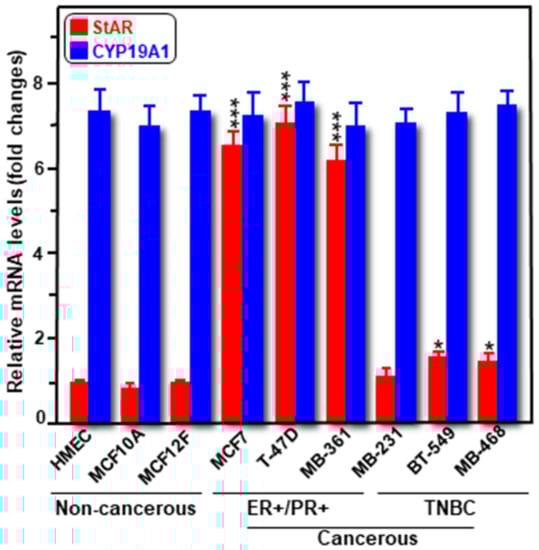 Expression of both StAR and CYP19A1 mRNAs was determined in a variety of human cancerous ER+/PR+ (MCF7, T47D, and MB-361) and TNBC (MB-231, BT-549, and MB-468), and non-cancerous mammary epithelial (HMEC, MCF10A, and MCF12F) cells. As determined by RT-qPCR, expression of StAR mRNA was markedly high (p < 0.001) in these three different hormone-dependent BC cell lines compared to the levels seen in either TNBCs or non-cancerous mammary epithelial cells (Figure 1). Specifically, StAR mRNA levels were between 6 and 9-fold, and ~1.7-fold, higher in ER+/PR+ and TNBC cells, respectively, over non-cancerous mammary epithelial cells. On the other hand, the expression of CYP19A1 mRNA was robust, but similar in various cancerous and non-cancerous breast cell lines [,]. E2 levels in media correlated with StAR, but not with aromatase, expression in these cells []. These data, consistent with our previous findings on both StAR and aromatase protein levels in various human malignant and non-malignant breast cells [], indicate that StAR expression is abundant in hormone-dependent BC cells, modest in hormone-independent subtypes, with little to none in normal mammary epithelial cells.